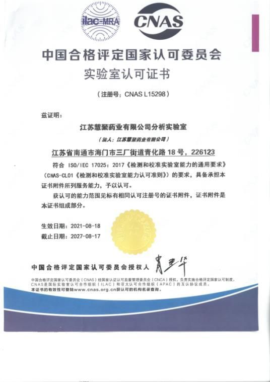 2021年8月18日,江蘇慧聚藥業(yè)有限公司通過審核,取得CNAS認(rèn)證證書。此次獲得CNAS審核,既是對分析實驗室的技術(shù)實力及體系管理實力的認(rèn)可,也是慧聚藥業(yè)建設(shè)國際一流實驗室道路上的關(guān)鍵一步。面向未來,分析實驗室將繼續(xù)秉承“數(shù)據(jù)準(zhǔn)確、運轉(zhuǎn)高效、行為公正、態(tài)度嚴(yán)謹(jǐn)”的質(zhì)量方針,嚴(yán)格按照法規(guī)要求、體系要求、國際標(biāo)準(zhǔn)、國內(nèi)標(biāo)準(zhǔn)認(rèn)真控制各檢測環(huán)節(jié),發(fā)揮各職能部門功能,完成各項檢測任務(wù),以專業(yè)的技術(shù)支持,確保檢測報告的準(zhǔn)確及時,持續(xù)提升客戶滿意度。