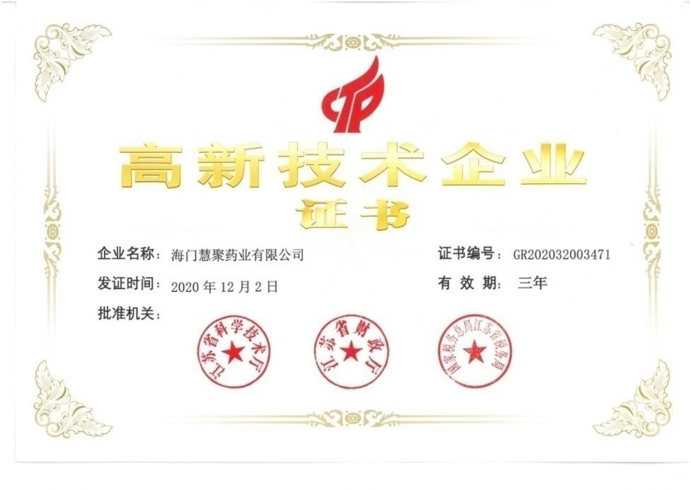 近日,慧聚藥業(yè)收到由江蘇省科技廳、江蘇省財(cái)政廳、國(guó)家稅務(wù)總局江蘇省稅務(wù)局聯(lián)合頒發(fā)的《高新技術(shù)企業(yè)證書》。公司自2008年首次通過“高新技術(shù)企業(yè)”認(rèn)定,這是慧聚藥業(yè)連續(xù)第5次獲得此項(xiàng)資質(zhì)。此次通過高新技術(shù)企業(yè)的再認(rèn)定,是對(duì)公司技術(shù)研發(fā)實(shí)力和科技成果轉(zhuǎn)化能力的肯定,將進(jìn)一步激勵(lì)公司持續(xù)加大科研投入,激發(fā)公司自主創(chuàng)新的熱情,在引入高精尖人才、提升科技創(chuàng)新能力、打造核心產(chǎn)品等方面持續(xù)發(fā)力,充分發(fā)揮高新技術(shù)企業(yè)的優(yōu)勢(shì)和引領(lǐng)作用。